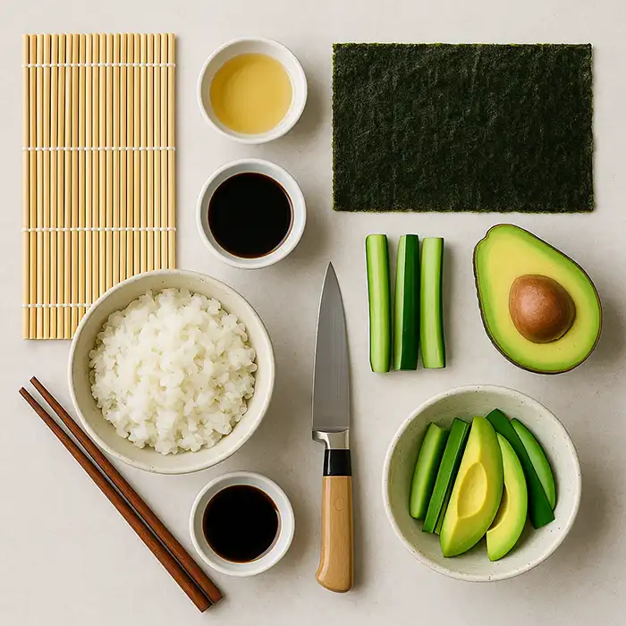 برنج سوشی (کوتاهدانه)، سرکه برنج، نوری (ورق جلبک)، فیلینگ (خیار، آووکادو، سالمون دودی یا میگو پخته)، سس سویا/واسابی/زنجبیل شور.